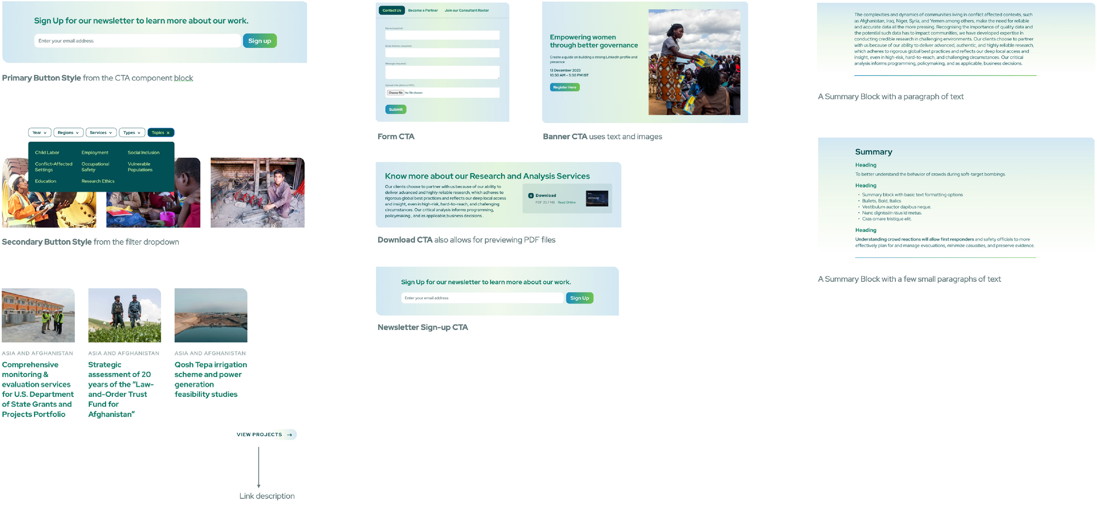 A few website components designed: Button and Link styles, CTA scenarios, and Summary Block variations