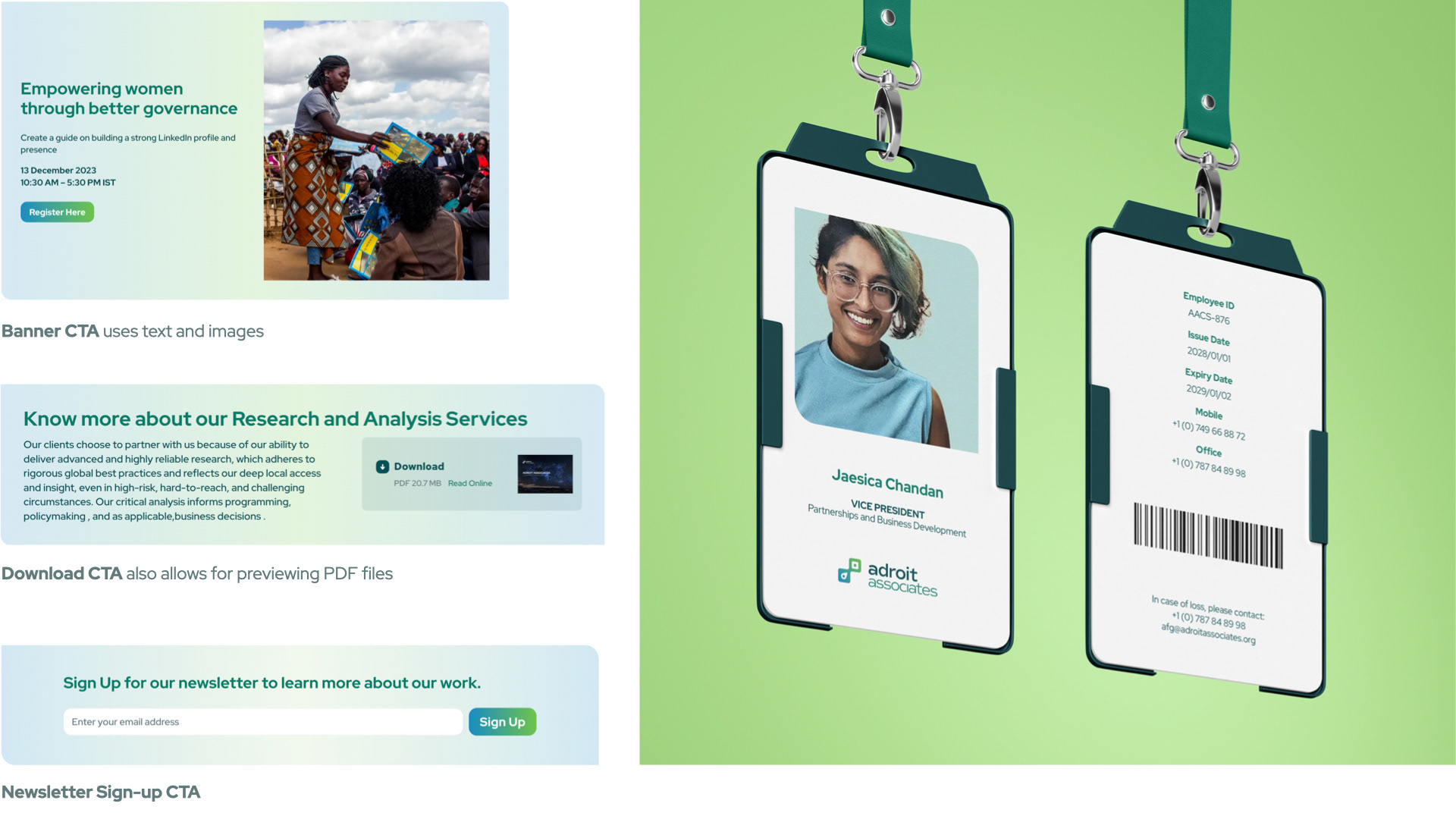 Left: Block devices used to highlight CTA components on the website; Right: Block device as a container for a photograph on an employee ID card
