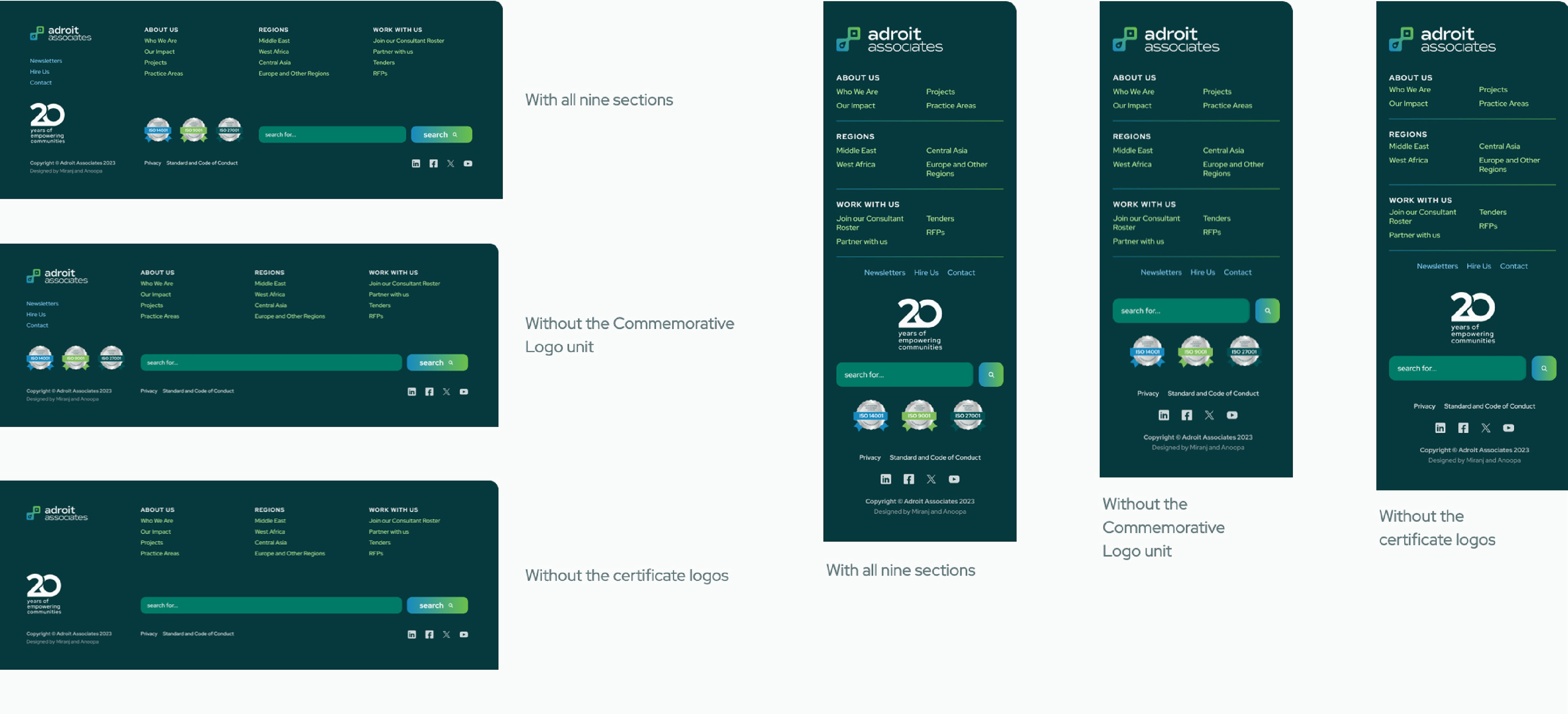 Three footer component scenarios, designed in collaboration with Miranj to maximise space while ensuring clear visibility of information